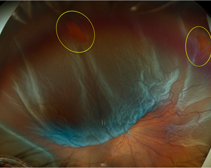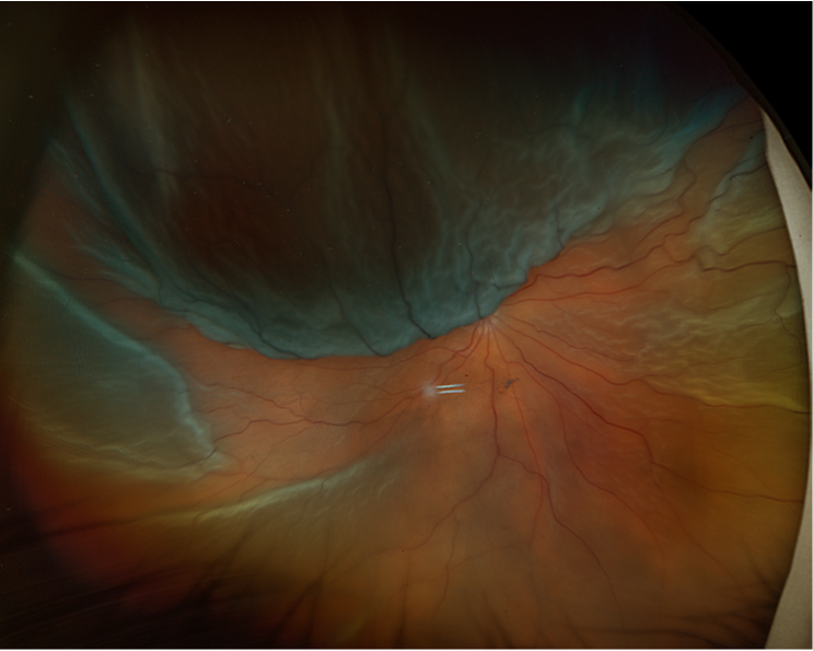 Abbildung 1. (a) Netzhautablösung, aufgenommen mit einer 200°-Primärblick-Aufnahme mittels UWF-RGB-Bildgebung.